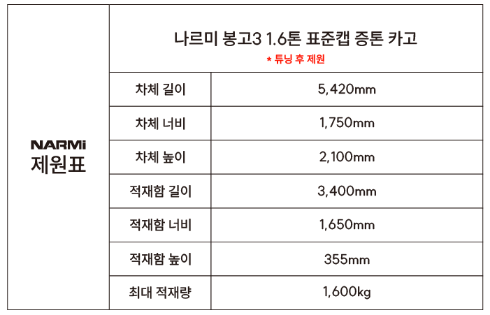 나르미 1.6톤 봉고 표준캡 증톤 카고트럭